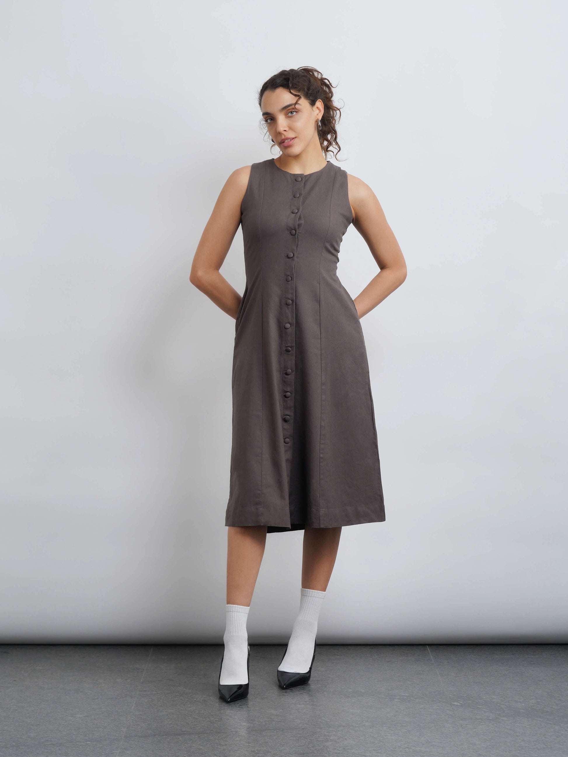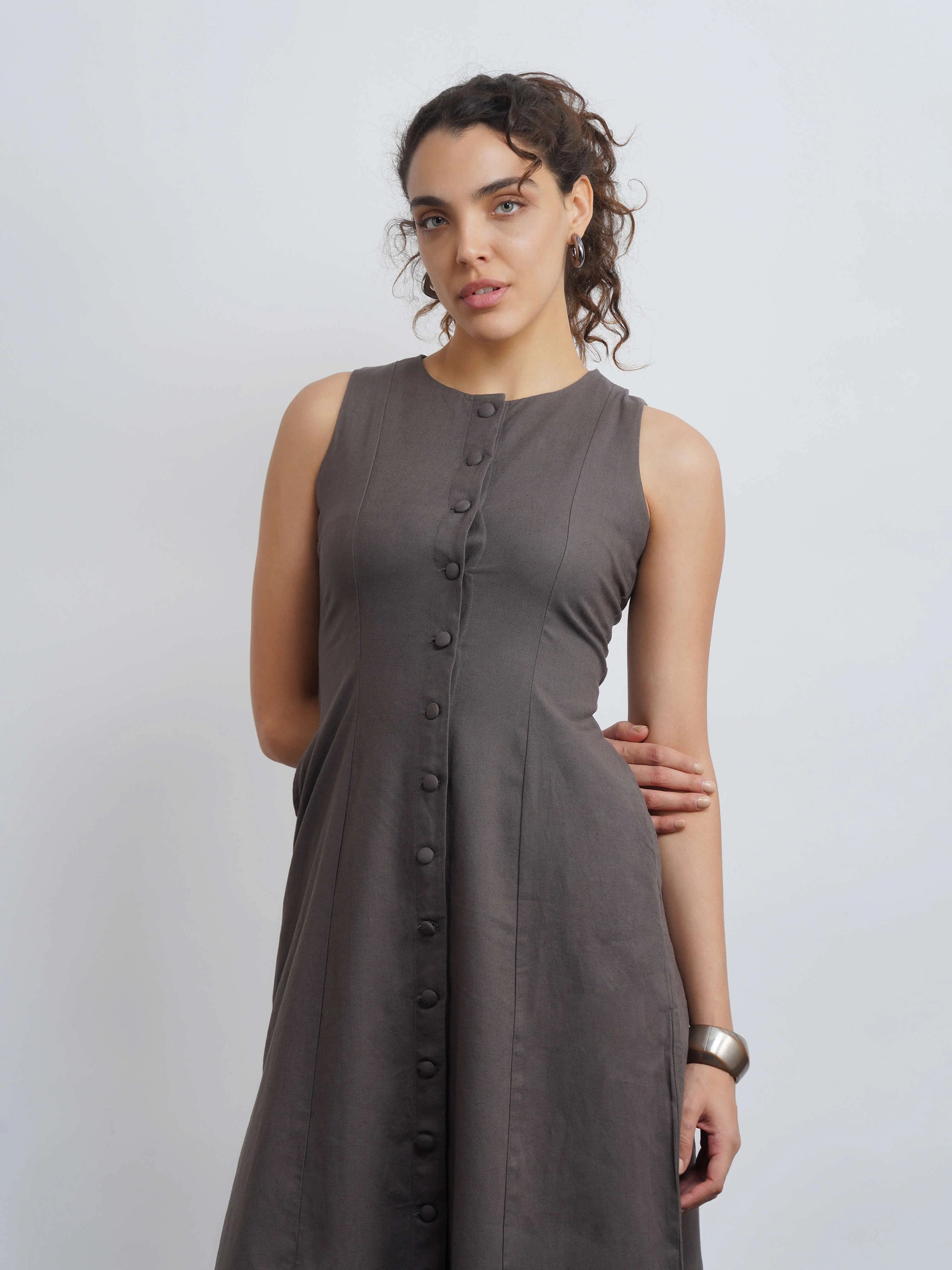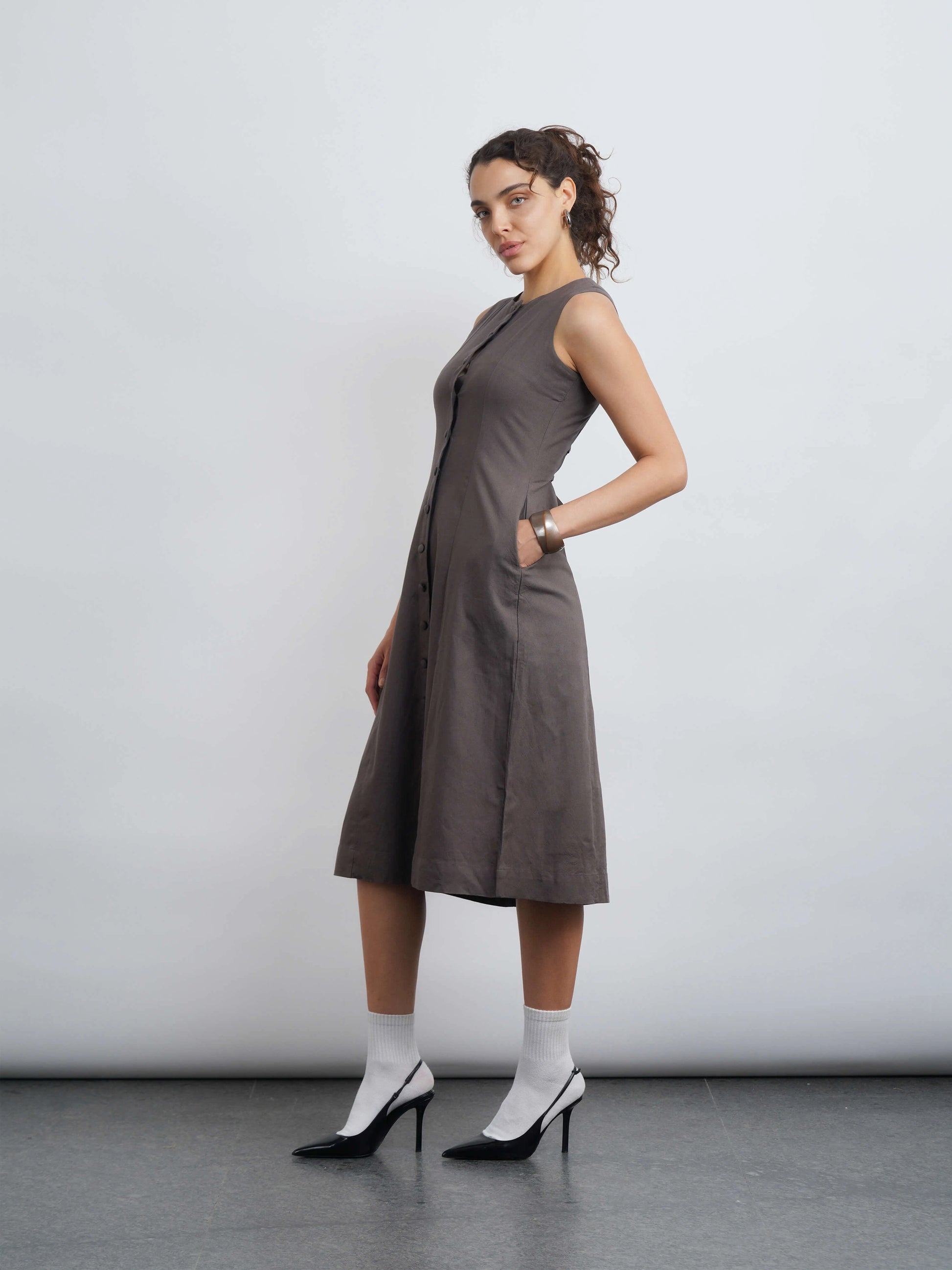 From AM meetings to PM celebrations—this sleeveless linen-viscose dress does it all. Clean lines, stylized buttons, and a flattering A-line fit make it the perfect 9-to-9 piece. Pair it with a structured jacket and flats for work, then switch to heels and a bold lip for the after-party.