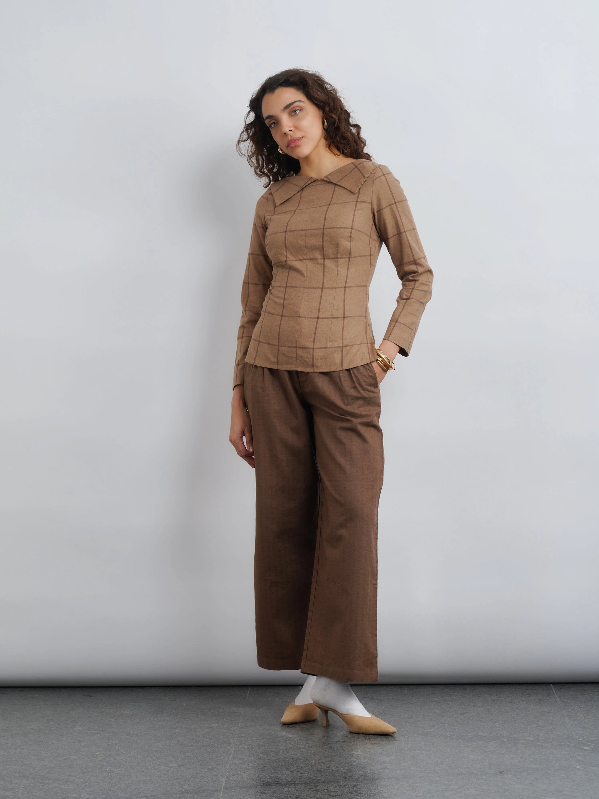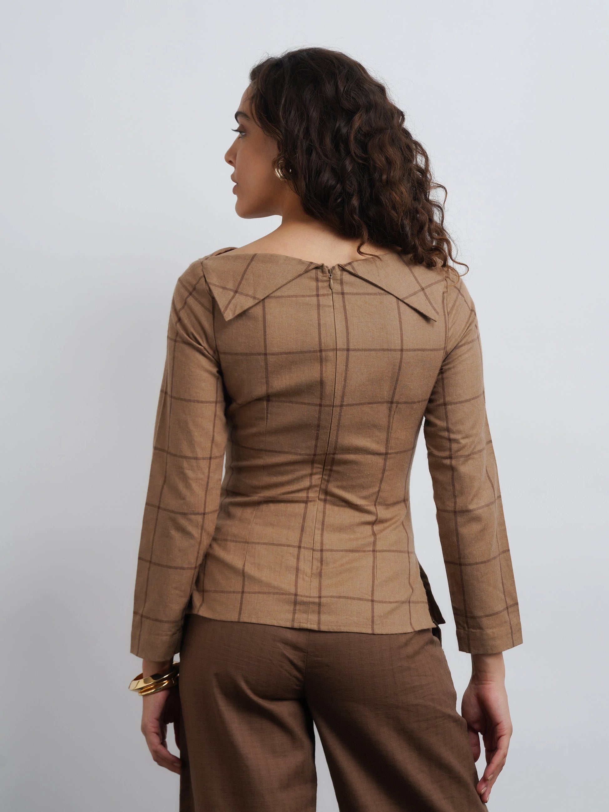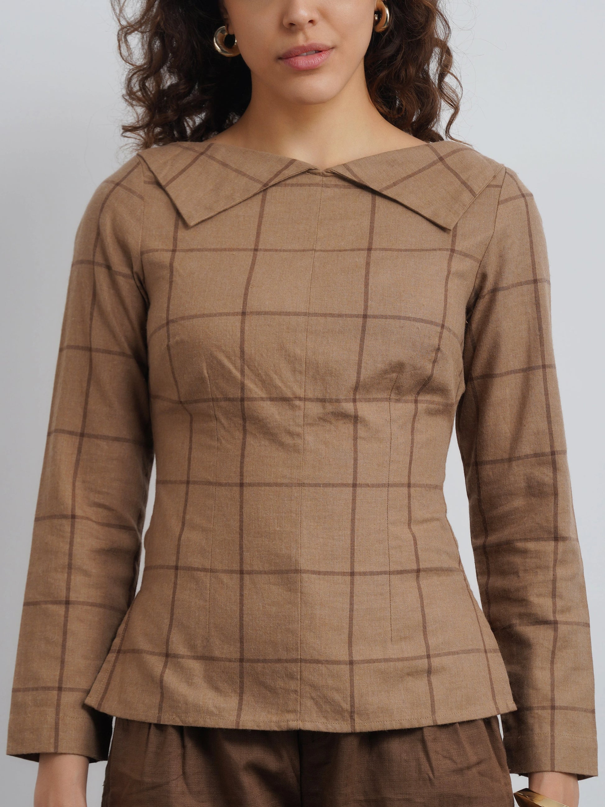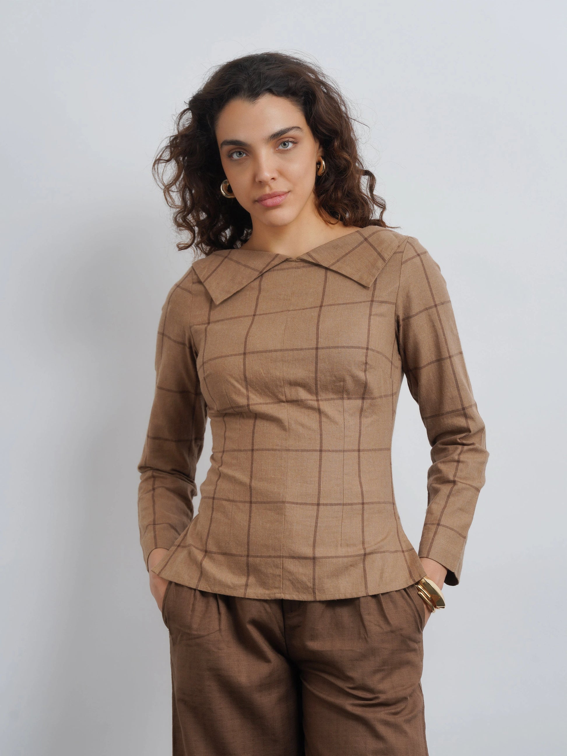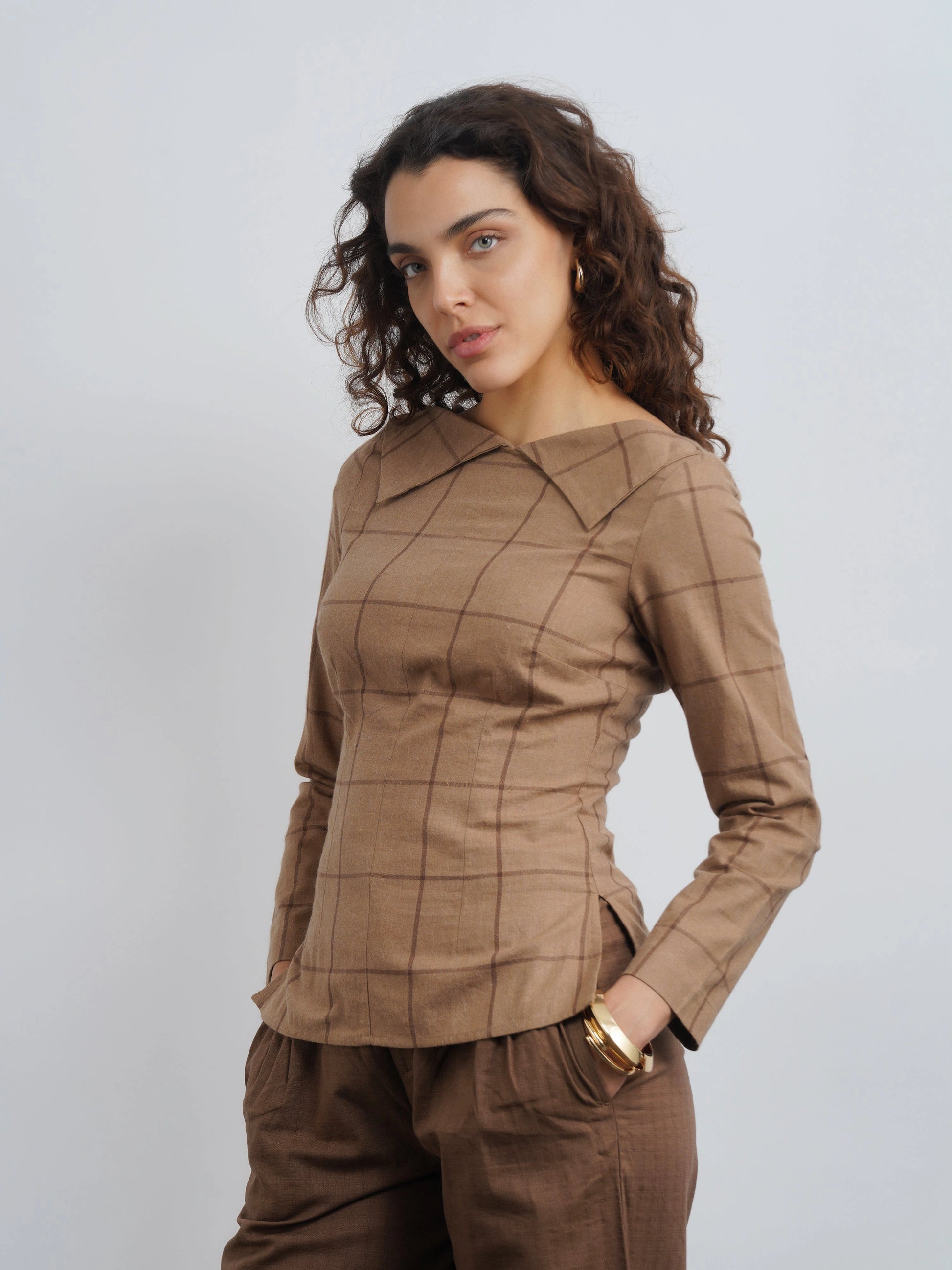 The Soho Top is a wardrobe essential that speaks volumes in quiet luxury. Tts boat neckline and stylized collar offers a subtle yet striking take on modern formalwear. Crafted from premium elevated check cotton, it blends structure with ease, making it as refined as it is comfortable. Whether paired with tailored trousers for a polished look or denim for understated elegance.