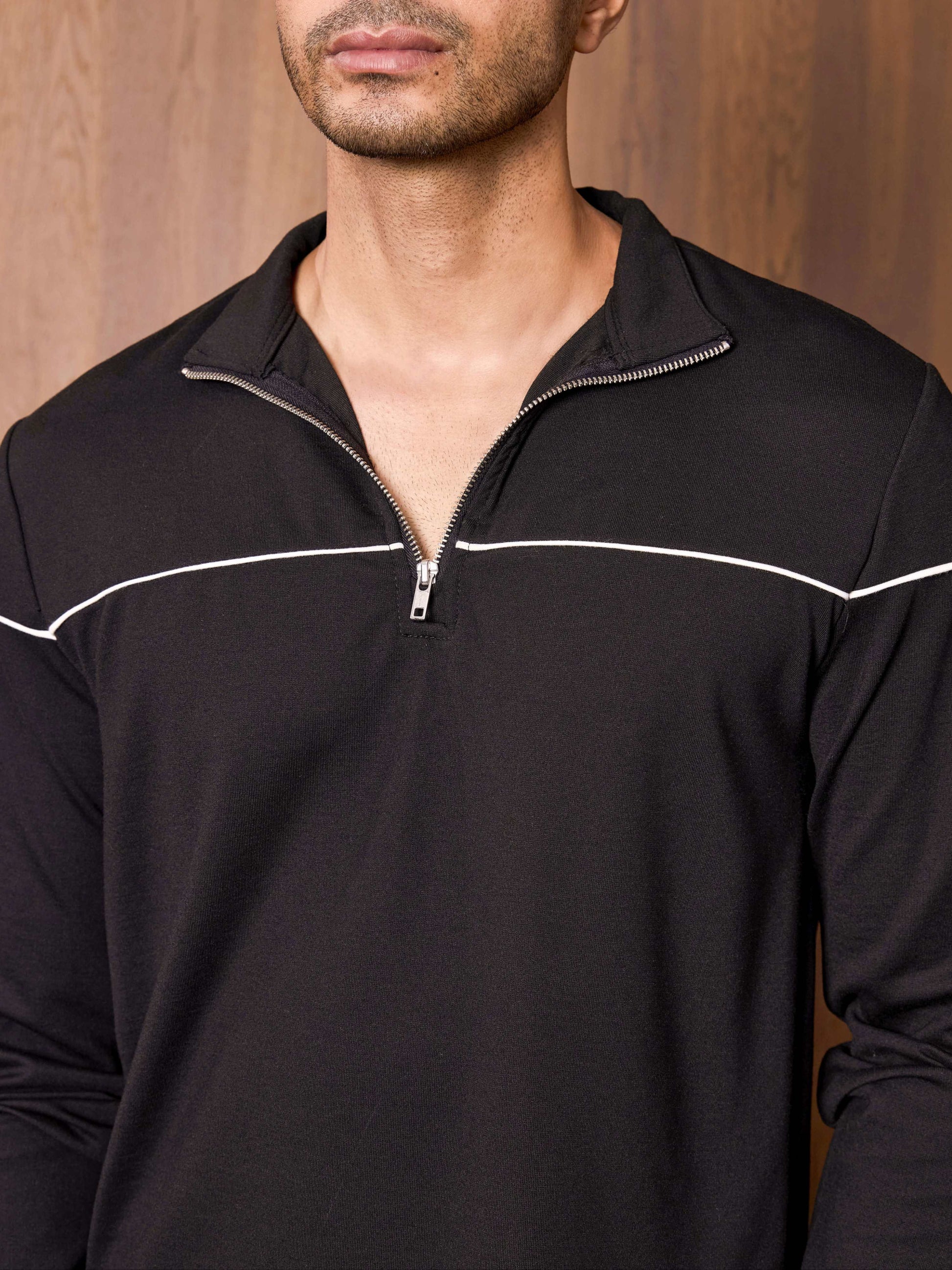 The Quarter Zip- refined in fabric, elevated in design. Crafted with a smooth, structured hand feel and accented by sharp white piping, it’s where comfort meets polish. Designed for the man who values ease without compromise. Perfect for workdays, weekends, and everything in between. Designed for all weather appropriate layering, Crafted from a technical blend that’s light, breathable, and sweat-wicking, keeping you polished and comfortable from work to weekend. The elevated half-zip collar adds a touch of modern sophistication. Whether styled over a crisp button-down or paired with tailored joggers, it’s the perfect balance of form and function.